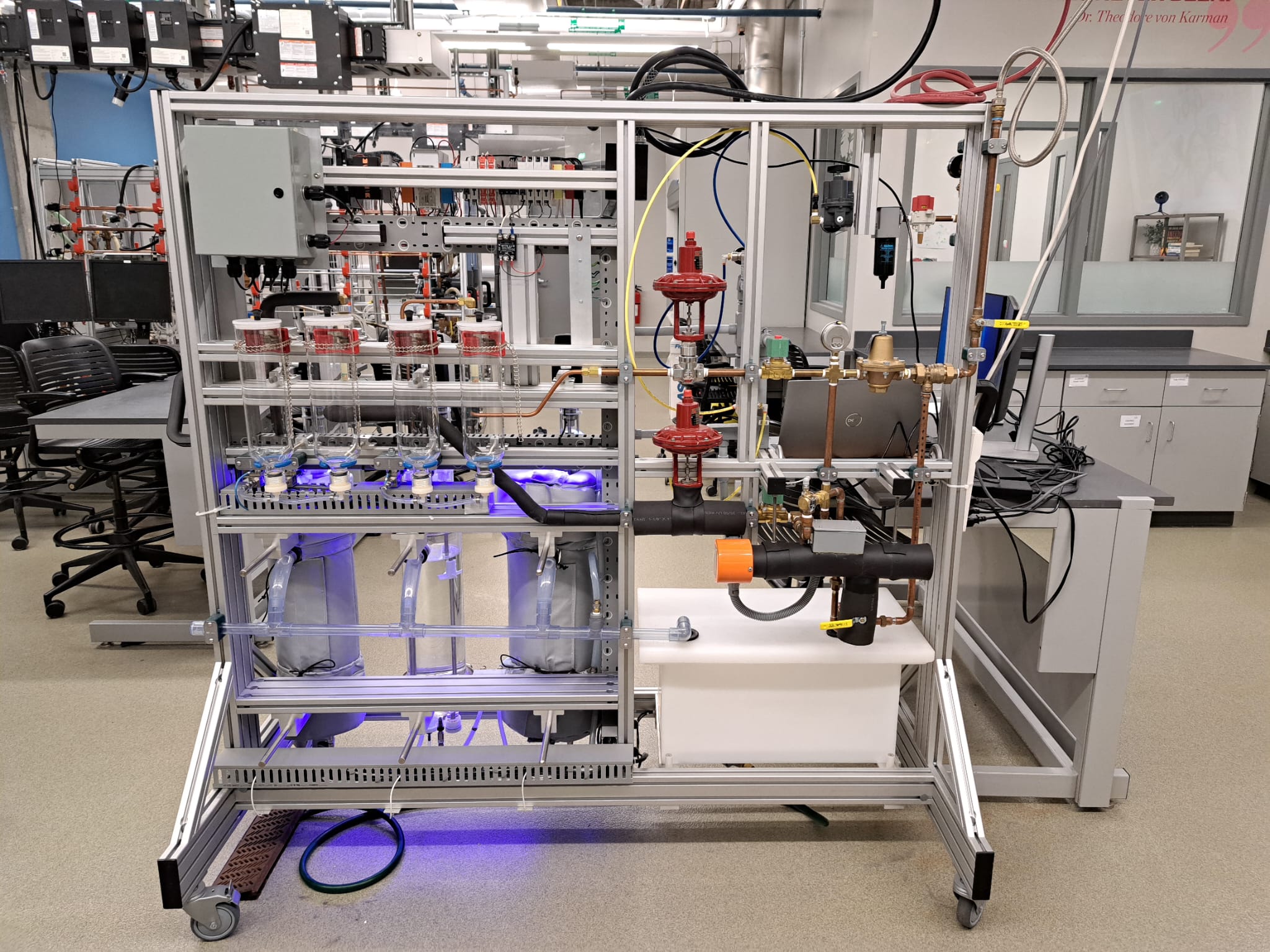Flexible multi-tank system equipped with automatic control valves, pumps, and digital instruments. Students design and implement control strategies to measure and regulate desired operating variables (flow, level, temperature, and pH). Applying concepts of process dynamics and control enables chemical engineers to specify controller settings that successfully maintain a process at target operating conditions.
